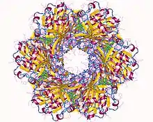 The cyanobacterial circadian system is so far unique in that it is the only circadian system in which the structures of full-length clock proteins have been solved. In fact, the structures of all three of the Kai proteins have been determined. KaiC forms a hexamer that resembles a double doughnut with a central pore that is partially sealed at one end.[26] There are twelve ATP-binding sites in KaiC and the residues that are phosphorylated during the in vitro phosphorylation rhythm have been identified.[27][28] KaiA has two major domains and forms dimers in which the N-terminal domains are "swapped" with the C-terminal domains.[29][30] KaiB has been successfully crystallized from three different species of cyanobacteria and forms dimers or tetramers.[31][32]