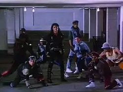 Jackson and background dancers in the "Bad" music video. Wearing clothing with a noticeable amount of buckles, Jackson showcased his "street-tough and edgy" image for the first time.[20] The video was heavily influenced by the 1961 film West Side Story.