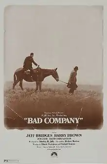 Bad Company is a 1972 American Western film directed by Robert Benton, who also co-wrote the film with David Newman. It stars Barry Brown and Jeff Bridges as two of a group of young men who flee the draft during the American Civil War to seek their fortune and freedom on the unforgiving American frontier.[1]