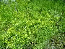 It is a variable, much-branched, over-wintering annual which normally flowers in late May. Its root system consists of long branched fibres which spread in whorls from the lower joints of the stem. The stems and leaves are a pale yellowish-green and the upper sides of the leaves are glossy. The name Adder's-tongue or Snake's-tongue describes the leaves. The flowers are relatively small and have canary-yellow petals. A single plant may have many flowers. These produce a large quantity of seed in a season. Ripe seed was collected in 1991, and sent for storage in the Kew Seed bank. A fuller description is available in the reserve handbook.[5]