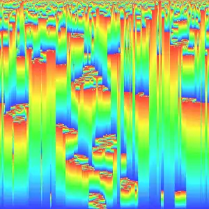 Sample of Bak–Sneppen model evolution: on the x-axis the population status, on the y-axis (from top to the bottom) the history of the population. Each discontinuity represents an evolution. The color codes the age of the species.