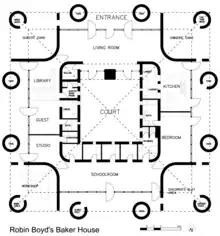 Boyd put much effort into considering the unique conditions of Australia and subsequently developed a style "related to Australian materials and conditions, to [the] light and its connection to Australian landscape". References to the work of Walter Burley Griffin are evident with large living spaces or courtyards becoming the centre of the house. The influence of Louis Kahn is also evident in the floor plan, where Boyd creates a sense of formality in the layout through the use of a perfect square. The use of such geometry also reflects the client’s profession as a mathematician and was described as "a plan of noughts and crosses".[3]