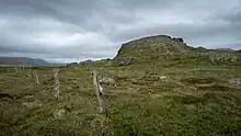 There are various historical places around Bakkagerði. The farm Hjaltastaður on the road to Egilsstaðir has an old wooden church, Hjaltastaðakirkja, dating from 1881.[6] Kirkjubaejarkirkja, built in 1851, is another wooden church in the west of Hjaltastaður with a ridge turret and a colourful pulpit dating from the 16th century.[7] The pulpit ist said to be oldest existing pulpit in Iceland.[8] The retable was created in 1894.[9] The church was renovated in 2001 exactly 150 years after the inauguration.[10] There is a track from Bakkagerði to Húsavík, a hamlet 20 km in the south which was abandoned in 1973.[11] Originally Húsavík consisted of four farms on the bay bearing the same name. The wooden church Húsavíkurkirkja was built 1937–39, and several of its pieces of art are exhibited in the National Museum of Iceland in Reykjavík now.[12]