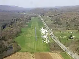The Ridge Soaring Gliderport in the Bald Eagle Valley, looking southwest toward Julian. Bald Eagle Mountain and Bald Eagle Creek are on the left, the Nittany and Bald Eagle Railroad and U.S. Route 220 are in the lower right, and the Allegheny Front is on the top right.