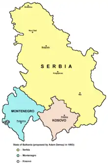 Balkania was the name of a proposed state in the Balkans, suggested by the Kosovo Albanian politician Adem Demaçi in 1993.[1] Intended as an alternative to Serb-Albanian ethnic conflict, it would have transformed the rump third Yugoslavia into a democratic confederation consisting of Serbia, Kosovo, and Montenegro.[2][3]