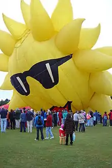The distinctive shape of "Sunny Boy" inflating ready to fly at the Balloons Over Waikato festival