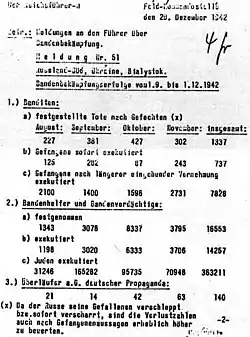 Also in October 1942—just a couple months prior to Gottberg's exploits—Reichsmarschall Hermann Göring had ordered "anti-bandit warfare" in Army Group Rear Area Center, which was shortly followed by an OKH Directive on 11 November 1942 for "anti-bandit warfare in the East" that announced sentimental considerations as "irresponsible" and instructed the men to shoot or preferably hang bandits, including women.[34] Misgivings from commanders within Army Group Rear that such operations were counterproductive and in poor taste, since women and children were also being murdered, went ignored or resisted from Bach-Zelewski, who frequently "cited the special powers of the Reichsführer."[35] During late November 1942, forty-one "Polish-Jewish bandits" were killed in the forest area of Lubionia, which included "reprisals" against villages in the area.[36] Another action undertaken under the auspices of anti-bandit operations occurred near Lublin in early November 1943; named Aktion Erntefest (Action Harvest Festival), SS-Police and Waffen-SS units, accompanied by members of the Lublin police, rounded up and killed 42,000 Jews.[37]