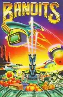Bandits is a 1982 fixed shooter written by Tony and Benny Ngo for the Apple II and published by Sirius Software.[2] The game is a clone of Taito's 1980 Stratovox arcade video game where the goal is to prevent aliens from stealing objects. Bandits was ported to the Atari 8-bit family,[3] Commodore 64, and VIC-20.