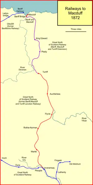 - ↑ Duncan McLeish, Rails to Banff, Macduff and Oldmeldrum: Three Great North of Scotland Railway Branch Lines, Great North of Scotland Railway Association, 2014, ISBN 978-0902343-26-9, page 5