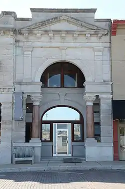 The Bank of Rogers Building is a historic commercial building at 114 South 1st Street in Rogers, Arkansas. It is an elegant two story Renaissance Revival structure with a limestone front. There are essentially two facades, one of which is set back under a large Roman arch, which forms the major element of the outer facade. This arch begins on the first level with square outer pillars and round inner ones, and is flanked on the second level by marble pilasters, which rise to support a projecting entablature and pediment. The inner facade has the main entrance under a segmented arch, with a pair of sash windows under a round arch on the second level.[2]