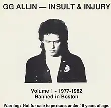 This compilation would see re-release in a couple of different variations over the years. In 1993, the entire CD was released with a different front cover (from photos Yarmouth took in 1983 and later of Allin) under the extended title Insult & Injury Volume 1 - 1977-1982 Banned in Boston, and the contents of same would also be split into two different CDs in 1998 as Banned in Boston, Volume 1 and Volume 2, with Volume 1 containing the studio recordings and Volume 2 featuring the live tracks and interviews. These versions are still available from Black & Blue Records today. In 1990, a new version was made with the Jabbers. This version of the album has a different track Listing and is only 37:18.