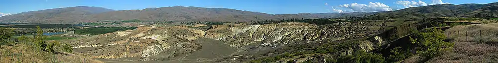 The plans for the settlement began in 1862, as a result of miners being forced upstream from rising water levels in the Clutha and Kawarau Rivers. Though the area was settled around this period, the population was not stationary. As miners followed gold up the creeks, the settlements tended to follow, and by 1868 the original settlement had been strung out along what is now the Bannockburn-Nevis road.[3] As miners swept over the area, from 1862 to 1871 the face of the landscape underwent drastic changes as the alluvial flat was washed away by sluicing operations to the foreboding landscape that exists today. Water during this period was a pivotal resource, not just for mining but to supply the town as well. Evidence of the complex water system that once existed is spread throughout the landscape. Multiple dams, (technically reservoirs) feed a water system that extends from high on the nearby Carrick range down to the abandoned sluicing sites.[4] Tippet's Dam was one of, if not the largest of these reservoirs. The water has since been redirected for horticultural and viticultural use and the sluicings rest dormant on land belonging to the Department of Conservation.