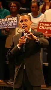 On March 8, 2008, Obama won the Wyoming caucus by nineteen points.[136] The Clinton camp continued to suggest that Obama would make a good vice presidential candidate for Clinton, and former President Bill Clinton made known his support of this as a "dream ticket" which would be an "almost unstoppable force".[137] On March 10, Obama flatly rejected such suggestions.[138] Obama noted that he, not Clinton, held the lead in pledged delegates and that he had won more of the popular vote than Clinton. "I don't know how somebody who is in second place is offering the vice presidency to somebody who is in first place", he said.[139] He told supporters in Columbus, Mississippi, that Clinton's VP suggestion was an example of what he called "the old okey-doke", further stating that the Clinton camp was trying to "bamboozle" or "hoodwink" voters.[140] Obama wondered aloud why the Clinton campaign believed him competent for the vice presidency, but said he was "not ready" to be president.[141] Obama stated that the nomination process would have to be a choice between himself and Clinton, saying "I don't want anybody here thinking that 'Somehow, maybe I can get both'," by nominating Clinton as president and assuming he would be her running mate".[142][143] Some suggested that it was a ploy by the Clinton campaign to denigrate Obama as less qualified for the presidency.[144]