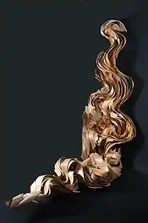 After moving to Chicago in 1987, Cooper began working with veneer scraps recycled from woodworking factories; the material connected her art to the greater ecological whole through a life cycle of extraction from nature, industrial processing and discard, and transformation into organic aesthetic forms.[10][1][2][33] Her process involved methodically bending and layering the fragile veneer in loose, interlaced weaves that created undulating, penetrable skins or shell-like armor around hollow, biomorphic cores: cocoon, spiral, bulb, limb, vessel and nest forms.[14][4][34][6]