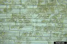 Barley Yellow Mosaic Virus (BaYMV) is a virus, and therefore doesn't divide, produce energy, or have any reproductive structures. The only way BaYMV is able to multiply is by "taking over" host cells and manufacturing more viruses. It is spread through the protist Polymyxa graminis, so its disease cycle largely depends on that of P. graminis.[5] P. graminis is a soil-borne pathogen, so it is spread by tools, water, animals, and other means of physically moving soil. BaYMV overwinters in the resting spores of P. graminis, and can survive decades in this state.[6] When P. graminis invades the roots of a plant and begins growing in the root cells, the BaYMV is transmitted from protist to barley through zoospores.[6] It then can enter barley plant cells and use the cell machinery to make more virus, thus infecting the plant. The virus does this by using its coat protein to gain access into plant cells, and then taking over cell machinery in the nucleus. It uses the cell machinery to manufacture more virus, and can rapidly reproduce this way. Once a plant is infected, there is no known way to "cure" the plant, so the plant stays infected indefinitely. The virus remains in the resting spores in the soil, and in this way it can infect other plants, overwinter, or be spread via cultivation or harvest (spreading the soil).[6]