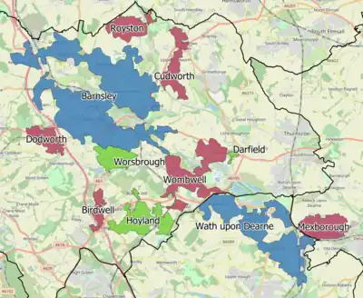 The Barnsley-Dearne Valley Built-up area is an urban area which extends from the town of Barnsley to Mexborough in South Yorkshire, England. The area takes in parts of the boroughs of Barnsley, Doncaster and Rotherham. The area includes villages and towns that lie in the Dearne and Rother Valleys. The area was recorded at having a population of 223,281.[1][2]