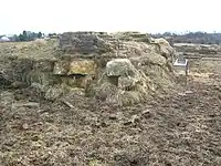 An ironstone quarry was also located at the site and the ore, crushed on site, was taken down the 'bogey line' via Brackenhills railway station on the Glasgow & South Western railway line to the old Glengarnock steelworks, owned by the Glengarnock Iron & Steel Co. Ltd.[12] The works closed in 1921, however the waste bings remained for many years.[4] The 'Beith Supplement and Advertiser' reported in 1912 that after a two-month-long strike at Glengarnock Steelworks the ironstone works at Dockra would be re-opening.[13]