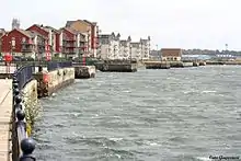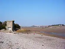 Following the Norman conquest of England the area was divided into manors with the Barry area split into two large lordships, Penmark and Dinas Powys. Penmark was split into the sub-manors of Fonmon, West Penmark and Barry. Dinas Powys was split into the sub-manors of Cadoxton and Uchelolau ('Highlight').[17] The sub-manor of Barry was granted by the de Umfraville family to the de Barri family and the seat of the manor was Barry Castle, located on high ground overlooking the Bristol Channel, a site occupied in Roman times by a native homestead.[18] The castle was a small fortified manor house, built to replace an earlier earthwork. By the late 13th century the castle had two stone buildings on the east and west sides of a courtyard. Early in the 14th century the castle was strengthened by the addition of a large hall and gatehouse on its south side, the ruins of which are all that survive today. By now Barry had grown into a village and port with its own church and watermill but in the 14th century its population was drastically reduced by the Black Death and the consequences of the rebellion of Owain Glyndŵr.[19] It took the population some 300 years to recover and once more hold the title of village, essentially a sparsely populated area with a few scattered farms and much of the land a marsh that a small river flowed through.[20] By 1622 the pattern of fields, where enclosure was almost complete, around Barry village was pretty much as it was to remain until the growth of the modern town. According to the 1673 hearth tax list the parish contained thirteen houses.
