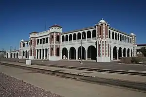 The Casa del Desierto station and hotel was built in 1911 by the Atchison, Topeka and Santa Fe Railway to replace an earlier one built in 1885 that burned in 1908.