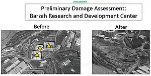 The Barzah scientific research centre, also known as the Barzah Scientific Research Facility,[1] is a facility of the Syrian Scientific Studies and Research Center (SSRC or CERS) located in Barzeh, Damascus. Several buildings at the centre alleged to be associated with a Syrian chemical weapons programme were destroyed during the 2018 missile strikes against Syria during the Syrian Civil War. Other buildings within the larger complex were undamaged.[2]