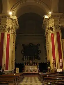 The interior has a basilica plan with three naves, 58.75 meters long and 24 meters wide at the transept, 36 meters high at the dome lantern.[26] The nave is covered by a lunetted barrel vault, while the two side naves, located to the left and right of the main nave, are covered by barrel vaults arranged orthogonally to the vault at the main nave.[26] Natural lighting is provided in the nave by six lunettes, three on each side, while in the dome by the lantern windows.[26] The total expenditure for the work was between 12,000[26] and 24,000 pontifical scudi.[27]