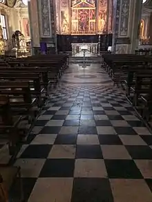 The floor, which was made of white, black and red Verona marble, was laid in the 18th century.[39][40] It has a geometric checkered pattern made with inlay, with the motif under the dome that converges towards the center of the basilica, recalling the lines of the vault and – more generally – the curved profiles of the surrounding vertical walls, which in turn close together in the dome above.[39][14]