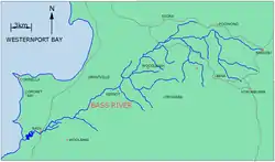 The Bass River rises below the locale of Woodleigh, west of the South Gippsland Highway, with its headwaters drawn from the Strzelecki Ranges, north of the town of Korumburra. The river flows generally south by west, joined by one minor tributary, before reaching its river mouth and emptying into the Western Port, west of the town of Bass within the Bass Coast Shire. The river descends 60 metres (200 ft) over its combined 59 kilometres (37 mi) course.[3]