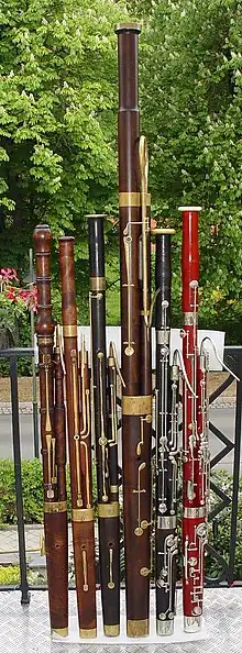 A collection of historical bassoons, from early baroque to modern, including a classical contrabassoon.