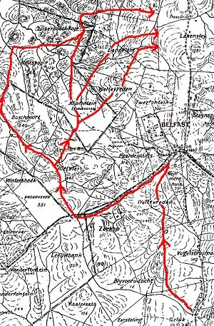 General French and his cavalry left Geluk very early and first called at Belfast. They left there at 09:00 and first proceeded west along the railway line, possibly to mislead Boer spies. When they were out of sight they swung right and unexpectedly appeared on the farm Boschpoort. The Boers and their Long Tom beat a hasty retreat, while French cleared the rest of the burghers from Zuikerboschkop and Langkloof. By 14:00 he could send a message to Pole-Carew that they could commence their march northwards. The Infantry Division experienced some cross-fire from the east and the Long Tom on Waterval fired a few shots as well.[28] The result of the march was that Pole-Carew was in command of all the high-lying ground between the railway line and Lakenvley.[29] Most of the Middelburg commando had simply fled.[30]