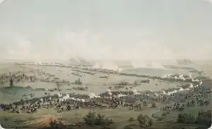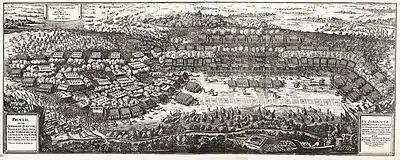 Since the beginning of April 1631, Magdeburg was besieged by imperial troops. The city's commandant Falkenberg was ordered by Gustavus Adolphus to hold the city for at least two months. Initially, Falkenberg had been able to take advantage of Tilly's hesitation for his siege, by strengthening the city's defenses and reorganizing his 2,500-strong garrison to be supported by 5,000 armed citizens.[41] But after the fall of Frankfurt, Tilly returned to Magdeburg at the end of April. He systematically attacked the city's outer defenses from several sides, which were gradually abandoned by the Swedish defenders. The Imperial troops dug trenches which, by mid-May, ran only five meters from the city's walls. On May 18, Tilly issued a final ultimatum for surrender to the city, which was subsequently refused by the city's counsil. On May 19, Tilly held a council of war with his generals where they decided to make a final assault on the city from six directions the following day.[43] During the morning of 20 May, the city was bombarded by Tilly's guns and Imperial troops broke into the city from several directions. The city was set on fire, Falkenberg and the entire city garrison were massacred, and the Imperial troops pillaged the city for several days while committing cruel acts of violence against the city's 25,000 inhabitants. By the time Tilly ordered an end to the looting on 24 May, Magdeburg was turned into a smoldering ghost town, resulting in the deaths of around 20,000 inhabitants.[44][39][45][46]