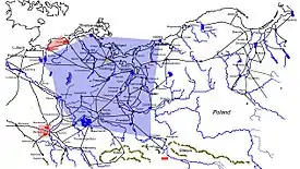 The battle took place on a gently sloping field about 10 kilometres (6.2 mi) north of Leipzig. The field covered an area of about 20 km2, with crossroads stretched between the villages of Breitenfeld in the west, Seehausen in the east, Podelwitz in the north and Wiederitzsch in the south. The marshy Lober stream flowed behind Podelwitz, which ran from Schladitzer See 4 kilometres (2.5 mi) west of the village. The Swedish army was drawn up in the open field just south of Podelwitz. The Saxon army was deployed on the Swedish army's western flank, between the villages of Zschölkau (3 kilometres (1.9 mi) northeast of Podelwitz) in the north and Göbschelwitz (2 kilometres (1.2 mi) north of Seehausen) in the south. Between Breitenfeld and Seehausen ran the Galgenberg, a pair of gently sloping ridges where Tilly placed his artillery, while his army was lined up just behind the ridges.[71] Behind his army, just northeast of Wiederitzsch, laid the deciduous Linkelwald forest. Tilly had his army camp between the villages of Eutritsch (3 kilometres (1.9 mi) south of Wiederitzsch) in the east and Möckern (4.5 kilometres (2.8 mi) south of Breitenfeld) in the west. A country road ran from Leipzig to the town of Düben in a north-easterly direction, through the eastern part of the Linkelwald and across the battlefield before crossing the Lober through Zschölkau. The battlefield is today bisected by the Bundesautobahn 14 and Bundesstraße 2 motorways, which have their exit to Leipzig-Mitte between Wiederitzsch and Seehausen.[65]