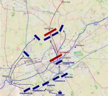 Acting on Pichegru's orders, Souham, who had withdrawn back to Aalbeke at the end of the day after the battle of Willems, turned his division back toward Courtrai.[13] On 11 May, Souham sent the brigades of Daendels and Winter to reinforce Vandamme at Courtrai.[14] Meanwhile, Souham ordered the brigades of Macdonald and Malbrancq to cross the Lys at Menin, and move northeast against Clerfayt.[13] The battle started at 3:00 pm and lasted until 10:00 pm. At first, Clerfayt's troops defended themselves stoutly, but by 6:00 pm Vandamme, Daendels, and Winter cleared their enemies from the Courtrai suburb. Soon after, Clerfayt unleashed a cavalry charge which dispersed Daendels' brigade.[14] However, at this time Malbrancq's brigade was able to join the fighting, the bulk of which was now centred at Lendelede, 4 mi (6 km) north of Courtrai.[16] Macdonald's brigade was unable to reach the battlefield before the end of the battle, only getting as far as Moorsele.