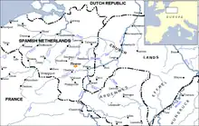 Waldeck eventually retired on Brussels, where his injured troops were replaced with men from fortress garrisons.[28] 15,000 Spanish troops under the Marquis of Gastañaga joined the main Allied army, as did Tilly with troops from Liège and Brandenburg on 22 July. On 2 August, the Elector of Brandenburg's forces combined with Waldeck, whose Allied army now numbered 70,000 men.[29] With this force, the Allied army marched to Genappe, proceeding on to Nivelles on 7 August. After the battle, there was modest satisfaction in the Dutch Republic. They believed that the French had suffered more soldiers killed or wounded and the French army was indeed in no better shape than that of the Allies to continue the campaign.[17]