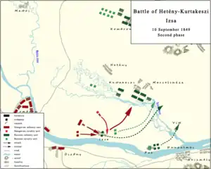 But the vigilant Cossacks thwarted this enterprise, and after a skirmish forced the hussars to retreat.[1] Then between Hetény and Kurtakeszi, the Russians deployed 2 infantry battalions, 4 uhlan companies, and 12 guns.[1] Battle of Hetény-Kurtakeszi-Izsa from 10 September 1849 - first phase. This shows that the Russians wanted to set a trap to the Hungarians, trying to make the Hungarian troops believe that the place is not properly defended, then, with considerable forces, to crush them.