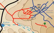 Hill 60 (Kaiajik Aghala) commanded the low ground occupied by a thin line of outposts between the Allied forces at Anzac and Suvla.[3] The hill was to be taken as part of an attack that stretched over a two-mile front from Hill 60 through Hetman Chair, Hill 70 and Oglu Tepe.[4] The initial attacking force was based on troops allocated to Major-General Herbert Cox by Lieutenant-General William Birdwood:[5][6]