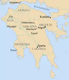 ![]() Map of Peloponnese,a peninsula of Greece. | |||||||
