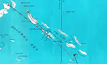 South Pacific area in 1942–1943. The U.S. troop convoy and warship task forces heading towards Guadalcanal (upper center) on 29 January 1943, originated at the major Allied bases at Espiritu Santo and Efate (center right) and Nouméa (lower right). Headquarters for Japanese land-based aircraft in the Solomons area was at Rabaul (upper left).