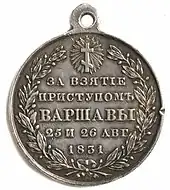 The battle of Warsaw (Polish: Bitwa pod Warszawą, Russian: Варшавская битва), also known as the battle and storming of Warsaw,[2] was fought in September 1831 between Imperial Russia and Poland. After a two-day assault on the city's western fortifications, the Polish defences collapsed and the city was evacuated. It was the largest battle and the final episode of the Polish–Russian War of 1830–31, a conflict that became better known as the November Uprising.