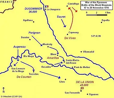 Dugommier sent his divisions forward on the night of 16 November 1794. Augereau advanced on the right flank while Pérignon moved forward in the center, supported by General of Brigade Charles Dugua's cavalry reserve. Sauret and General of Brigade Claude Perrin Victor mounted feint attacks on the left flank.[8] Augereau's attack on the cannon foundry in Sant Llorenç de la Muga and Terrades proved successful, forcing de Courten to pull back his Spanish and French Émigré troops toward Llers. Attacks by Pérignon in the center and Sauret on the left failed in the face of intense Spanish artillery fire from the area of Capmany. A force of Spanish cavalry and infantry under the French royalist Count of Ghent broke through Sauret's line to Cantallops but were driven back with the help of French reinforcements coming from the Pass of Banyuls in the east.[9] On the morning of 18 November, Dugommier, Representative-on-mission Pierre Delbrel, and staff officers watched the combat from the summit of Montroig. The presence of a battery of French guns and the party of French officers drew considerable counter-battery fire from Spanish cannons. About 7:30 AM, an artillery shell exploded nearby and a fragment tore the commanding general's arm off, killing him.[10]