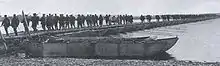 Japanese engineers determined that ten bridges 1,630 yards (1490.5m) would be required to span the river. A third of these were steel prefabricated pontoons which weighed 100 pounds each.[4] The remainder were made from local resources. In full view of Russian positions, the Japanese began constructing a causeway across the Yalu River, which was immediately targeted by two Russian batteries. With the Russians so engaged, the Japanese prepared nine other bridges that could quickly be moved into position for a rapid assault across the river at other locations.