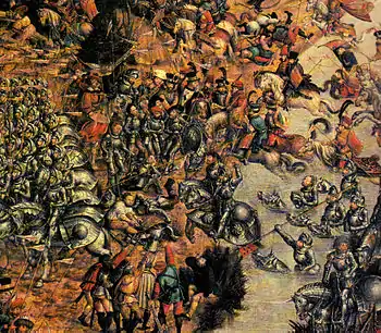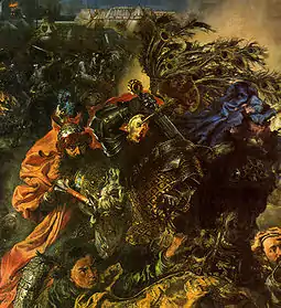 In the history of warfare in Western Europe the end of the medieval period is strictly connected to the end of chivalry, its ethos, and its method of fighting.[4] In Poland, as well as in some other countries of Eastern Europe, knights (noblemen, the Polish szlachta) were called for war (pospolite ruszenie) until the end of the 18th century, or until the end of the (Saxon times).[5] In such circumstances the criteria for the end of the chivalry ethos - as the end of medieval times in Poland - has to be rejected.[6] Rather, the appropriate moment is more likely the time when heavy cavalry, with its full plate armour, was replaced with lighter formations like the husaria. The painting, in the collection of National Museum in Warsaw, known as The Battle of Orsza depicts the common fighting formations of heavy, armoured cavalry, and light hussars. The Battle of Orsha took place in the Fall of 1514. During the battle of Obertyn (1531) there was only light cavalry present on the Polish side. It is possible (but speculative) that these two dates are the border points; the last medieval battle (Orsha) and first battle of modern times (Obertyn).[7]
