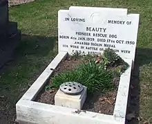 Beauty died on 17 October 1950, and was buried in the Ilford Animal Cemetery, founded and operated by the PDSA. She is one of several winners of the Dickin Medal to be buried at the PDSA cemetery in Ilford.[3]