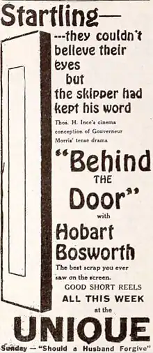Behind the Door is a surviving 1919 silent war drama film produced by Thomas Ince, directed by Irvin Willat and distributed by Paramount Pictures. The picture is a starring vehicle for veteran actor Hobart Bosworth and the supporting cast features Jane Novak and Wallace Beery. The film's source is a short story by Gouverneur Morris, also titled "Behind the Door," published in McClure's Magazine in July 1917.[1] The film is extant at the Library of Congress and the Gosfilmofond Russian State Archive.[2][3][4][5] In 2016, the San Francisco Silent Film Festival, working with the Library of Congress and Godfilmofond, created a more fully-restored print of the film.[6]