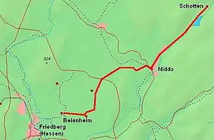 - the section branching from the Friedberg–Mücke railway from Friedberg in Beienheim station (this section of line is also known as the Horloff Valley Railway) and running to Nidda; this was opened in 1897 and is still in operation, and