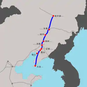 The line is part of the Harbin–Hong Kong (Macau) corridor, and is 1,700 km (1,100 mi) long. The distance between Beijing and Harbin in 1,198 km (744 mi) after opening of this section in Jan 2022.[1] It comprises the sections: Harbin–Dalian high-speed railway, the Beijing–Shenyang high-speed railway, and the Panjin–Yingkou high-speed railway.
