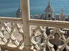 On the outside of the lower bastion, the walls have spaces for 17 cannons with embrasures affording a view of the river.[24] The upper tier of the bastion is crowned by a small wall with bartizans in strategic places, decorated by rounded shields with the cross of the Order of Christ encircling the platform. King Manuel I was a member of the Order of Christ,[25] thus the cross of the Order of Christ is used numerous times on the parapets.[3][7] These were a symbol of Manuel's military power, as the knights of the Order of Christ participated in several military conquests in that era.[25] The bartizans, cylindrical turrets (guerites) in the corners that served as watchtowers, have corbels with zoomorphic ornaments and domes covered with ridges unusual in European architecture, topped with ornate finials. The bases of the turrets have images of beasts, including a rhinoceros.[5][16] This rhinoceros is considered to be the first sculpture of such an animal in Western European art[5] and probably depicts the rhinoceros that Manuel I sent to Pope Leo X in 1515.[26]