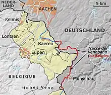 One specific feature of the border is the route of the Vennbahn railway.[2] The Vennbahn railway route has been Belgian territory since 1919, under the provisions of the Treaty of Versailles. The Treaty decided that the former German area of Eupen-Malmedy should be ceded to Belgium, along with the entire Vennbahn railway route which crossed the border several times. Border stones can be found on the right and left of the route. Due to the route of the now defunct railway, six exclaves of Germany, completely surrounded by Belgian territory, as well as one counter-enclave, were created. Today five German enclaves remain surrounded by Belgian territory, consisting of the village Mützenich as well as parts of the districts of Monschaus and Roetgens.[3] Following land swaps, the sixth enclave and the Belgian counter-enclave, no longer exist.