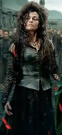 The first chapter of Harry Potter and the Deathly Hallows implies that Voldemort is still angry with Bellatrix, as evidenced when he makes fun of the fact that her niece Tonks married werewolf Remus Lupin.[8] However, Voldemort gives Bellatrix a chance to "prune" her family tree during the Death Eaters' attempt to capture Harry as the boy departs from the Dursleys' home, during which Bellatrix unsuccessfully tries to kill Tonks.[9] In this book, Rowling reveals that Bellatrix is the guardian of Helga Hufflepuff's cup (though she is unaware that it is a Horcrux), which Voldemort has entrusted the Lestranges to keep in their Gringotts vault. Bellatrix and the Malfoys detain Harry, Ron Weasley, and Hermione Granger at Malfoy Manor, and Hermione is tortured by Bellatrix when she suspects the trio has broken into her vault, but Dobby appears and saves the prisoners, though not before being hit by a knife thrown by Bellatrix as they disapparate to safety. Later in the book, Harry, Ron, and Hermione use a stray hair of Bellatrix's to disguise Hermione as Bellatrix using Polyjuice Potion, in order to gain access to the Lestrange's Gringotts vault. Though Voldemort apparently punishes Bellatrix and the Malfoys severely for interrupting his Elder Wand side quest only to have Potter escape and steal the cup, she nevertheless fights for her master in the Battle of Hogwarts towards the end of the novel. When the battle resumes inside the Great Hall after Harry's supposed death, Bellatrix simultaneously duels with Hermione, Ginny, and Luna Lovegood, none of whom is a match for Bellatrix, who nearly hits Ginny with a Killing Curse. An enraged Molly Weasley engages Bellatrix in a duel and fires a curse that hits Bellatrix right over the heart, killing her.[10] Rowling revealed that, though there was speculation that Neville would kill Bellatrix, she had always intended Molly to do so because the author wanted to match Bellatrix's obsessive love with Molly's maternal love.[11]