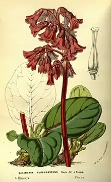 - 1 2 "Bergenia purpurascens (Hook.f. & Thomson) Engl". Plants of the World Online. Board of Trustees of the Royal Botanic Gardens, Kew. Retrieved 8 April 2021.