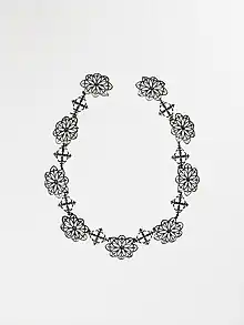 The roots of Berlin iron jewellery in Berlin can be traced back to the establishment of the Königliche Eisengiesserei bei Berlin or Royal Berlin Foundry in 1804.[2] The Royal Berlin Foundry started with the production of iron goods such as vases, knife stands, candelabra, bowls, plaques and medallions, as well as more commercial articles such as fences, bridges and garden furniture. The first jewellery items, such as long chains with cast links, were produced in 1806. Later, necklaces consisting of medallions and joined with links and wirework mesh were manufactured.[1] When Napoleon took Berlin in 1806, the moulds appear to have been taken back to France, where further production took place for some years.[3]